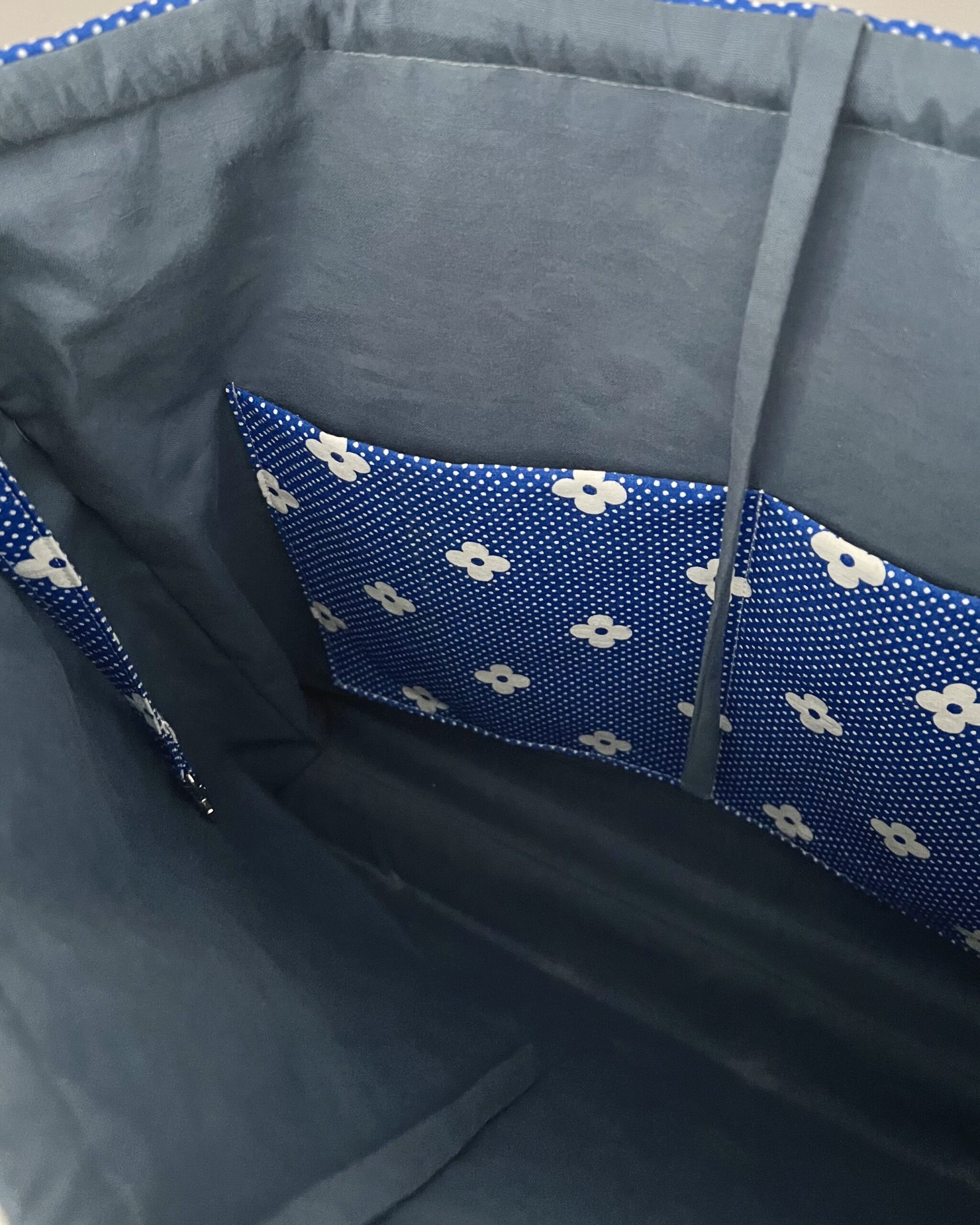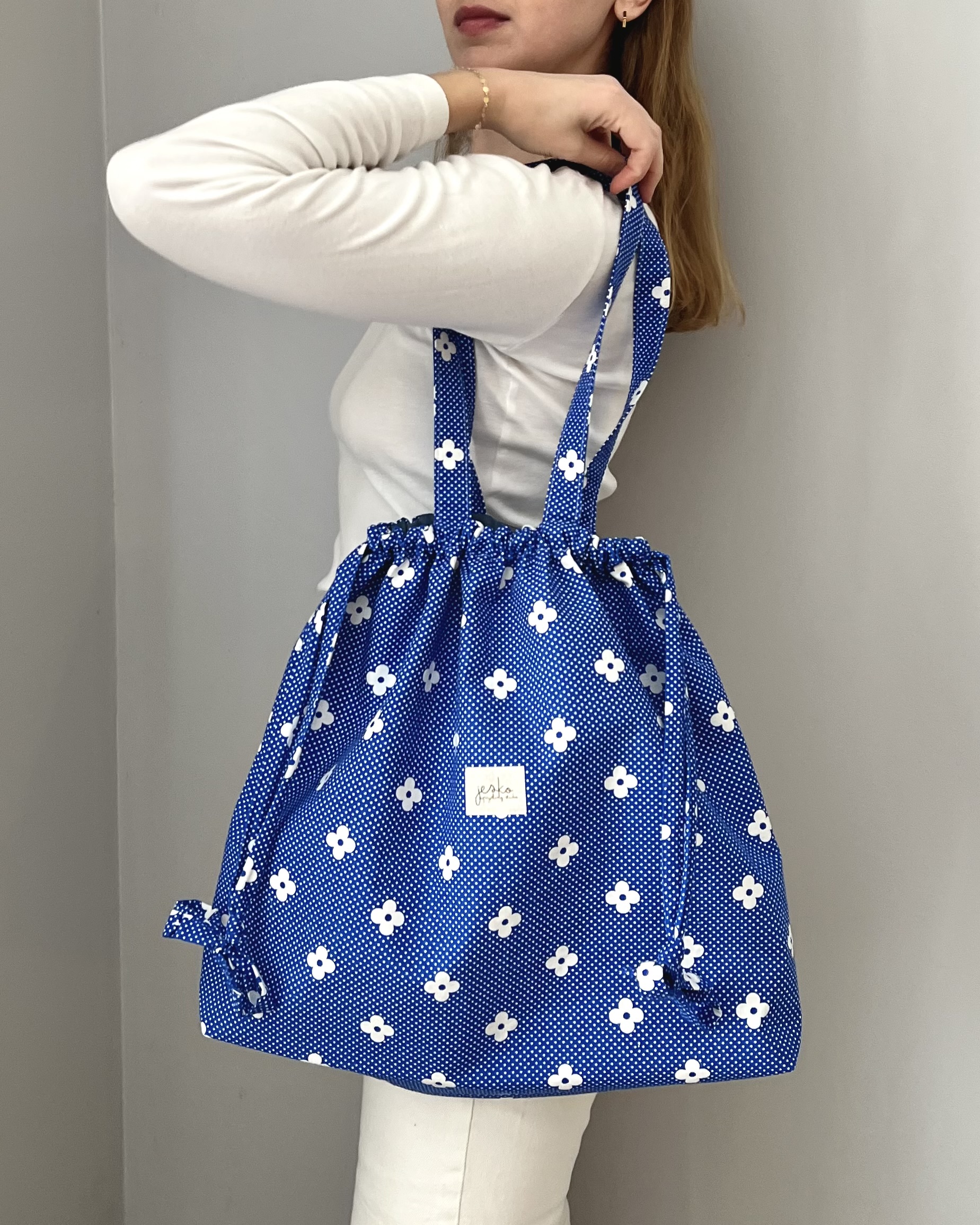 Uszyta ręcznie w duchu upcyclingu, z materiałów z drugiego obiegu, w małym studio w Poznaniu. Duża, pojemna torba, idealna do pracy, na uczelnie, na zakupy. Gdziekolwiek potrzebujesz. Zwężana, dzięki czemu masz pewność, że nic ci z niej nie wypadnie ani nikt z niej niczego nie wyciągnie. W środku ma dodatkowe wiązanie, kieszonkę z dwoma przegródkami i karabińczyk, na który możesz zaczepić klucze, kosmetyczkę, słuchawki lub inne przydatne rzeczy.